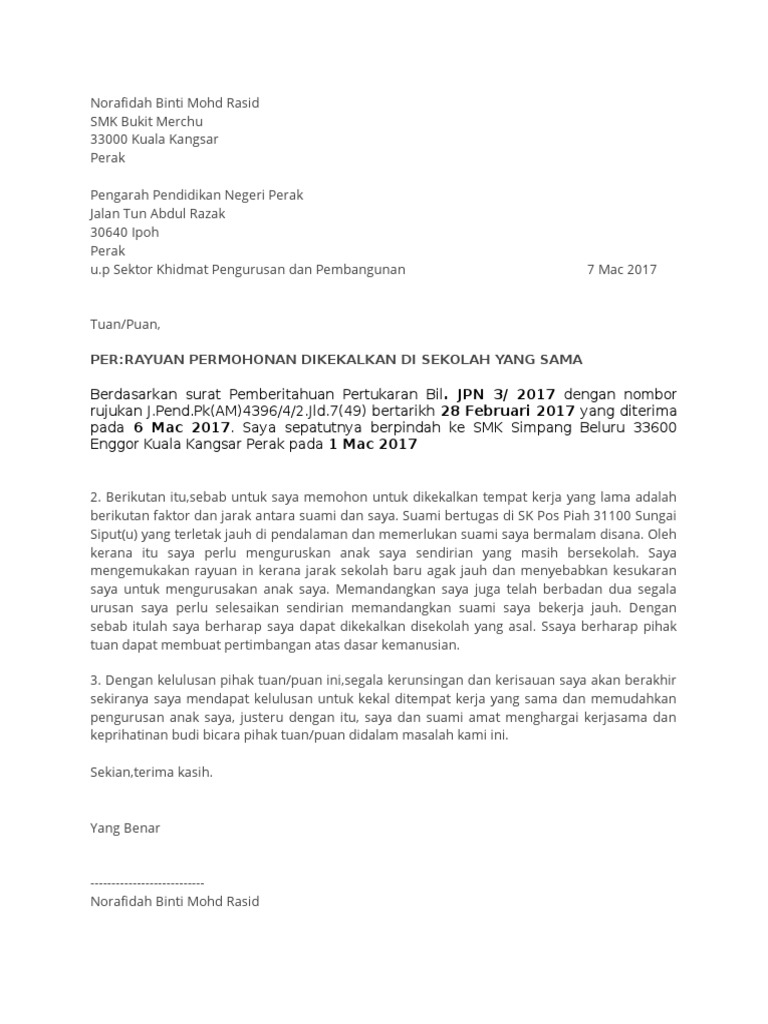 Contoh Surat Rayuan Kekal Di Sekolah